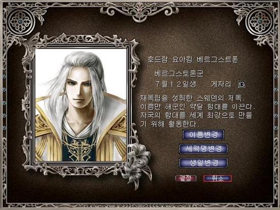호드람 요아킴 베르그스트론 : 스웨덴의 해군이며 상당한 재능으로 두 번째 항해 때 제독까지 승진한 캐릭터입니다. 스웨덴의 특성상 포르투갈, 스페인 등이 차지한 각 지역을 빼앗아야 하기 때문에 다른 캐릭터에 비해 난이도가 높습니다.