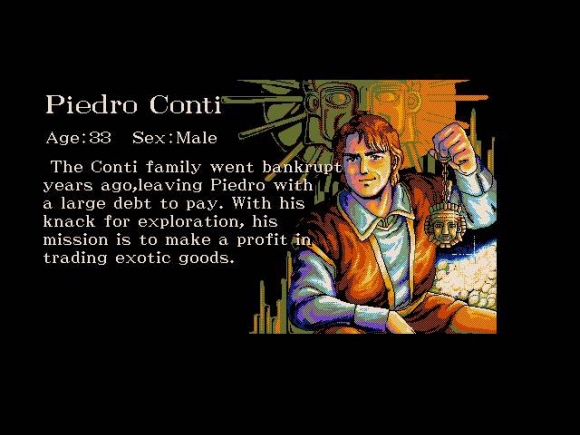 피에트로 콘티 : 엄청난 빚을 지고 있는 이탈리아의 모험가입니다. 모험 위주로 게임을 하게 되며 그의 항해 목적 중 하나는 황금의 도시 ‘엘도라도’를 찾는 것입니다.