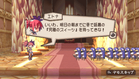 다음 볼 게임은 잡 셰어링이란 이런 것이다를 보여주는 동시에 가장 약한 캐릭터도 또한 마음먹기에 따라 주인공이 가능하다는 인식의 전환을 보여주는 게임이다. 그 것은 바로 PSP로 발매된 바 있는 ‘프리니 제가 주인공 해도 되겠슴까?’ 이다. 주인공 이름은 ‘프리니’로 ‘마계전기 디스가이아’를 플레이 해 본 분들이라면 익숙한 캐릭터일 것이다. 프리니는 한 대만 맞아도 죽고 마는 매우 약한 캐릭터이지만 이번 만큼은 걱정할 필요가 없다. 이 게임에서는 주인공인데다 무려 1000명의 프리니가 1소대(왜 천명인데 1소대밖에 안되는지 궁금하긴 하다)를 꾸려 마신(魔神) 에트나를 위한 궁극의 간식을 마련하러 가는 대원정을 떠난다.