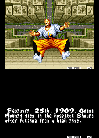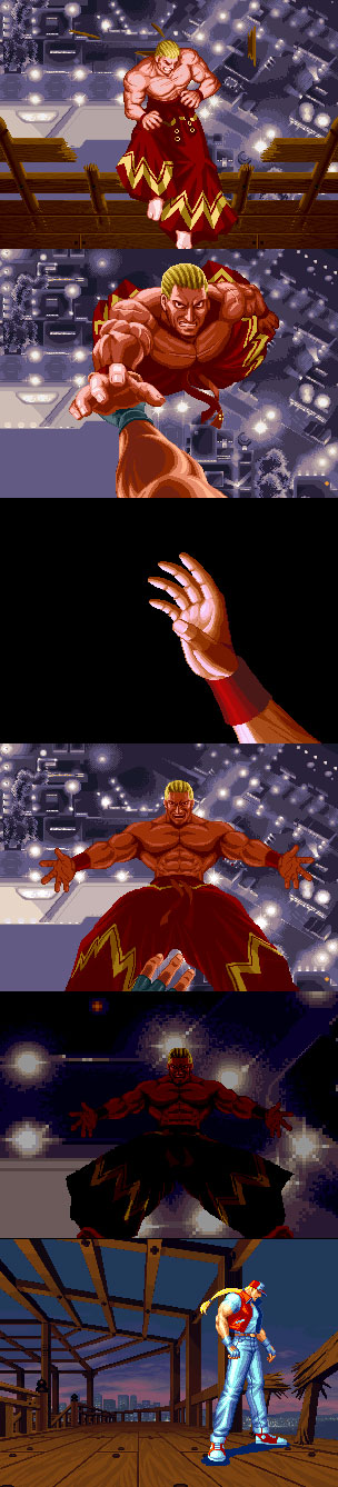 ▲ 리얼바우트 아랑전설의 엔딩. 기스는 테리의 손도 뿌리치고 직접 죽음을 선택했다.