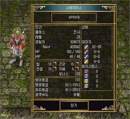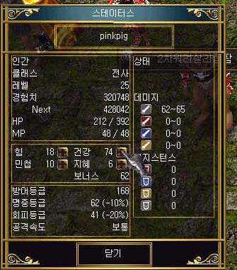 누적되었는지가 궁금했다. 일단 안전하게 마을로 텔레포트 한 후 [s]키를 눌러 캐릭터의 상태를 확인했다.