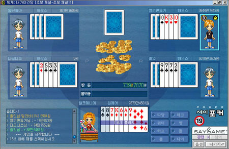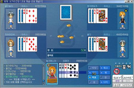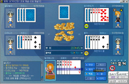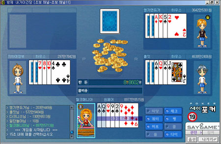 6구를 받은 모습. 자, 다른 사람들은 스트레이트가 말라가고 모두 페어 싸움으로 집중된 모습이다. 거기에 비해서 필자는 ◆가 연속으로 4장 들어오는 바람에 현재 플러쉬와 스트레이트를 맞보기하고 있는 상황이다. 올잇님의 플러쉬 가능성이 마음에 걸리기는 하지만 만약에 같이 플러쉬가 뜬다는 가정이라면 내가 이길 확률은 아주 높다(나는 A.K 플러쉬다). 하지만 현재 아무리 유망한 상황이라도 냉정하게 본다면 나는 아무 족보도 없는 깡패다. 액면에 깔려있는 3 사람 중 아무도 이길 수 없는 상황이라는 것이다. 이럴 때는 알겠지만 액면에 플러쉬가 4장이 깔려있다고 해도 블러핑이 잘 먹히지 않는다.