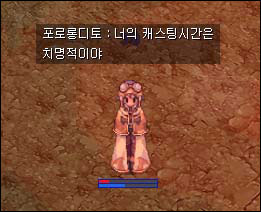 모두들 천년제황의 파워에 넋이 나가있을 때 조용히 천년제황의 패배라는 것을 직시한 것은 바로 체리..였다. 체리가 먼저 말을하기 시작했다. “분명 데미지는 천년제황쪽이 한수위야... 하지만 사냥을 할 때 어느쪽이 더 유리하냐고 묻는다면 공교롭게도 포로롱디토 쪽이야...” 천년제황이 당황하면서 물었다. “무슨 소리야? 내 위력을 못본거야?” 포로롱디토가 그제서야 입을 열기 시작했다. 모든 의문이 밝혀지는 순간이었다 “너는 너무 데미지에 의존해있어. 보면 알겠지만 레벨 60에서 인트를 91까지 올렸다는 것은 분명히 어질은 40미만이라는 계산이 나오지. 그렇지? (천년제황이 끄덕끄덕) 너의 마법 캐스팅 시간을 보고 눈치챘지. 내 소울스트라이크를 3~4방 발사할 시간에 너의 레벨 10짜리 라이트닝볼트는 1발밖에 발사할 수 없어, 더욱이 선공몬스터가 많은 이곳에서 캐스팅 속도가 길다는 것은 치명적이지... 캐스팅이 캔슬될 확률이 높아지거든. 라이트닝볼트의 레벨을 낮춰서 사용하도록 해. 그게 훨씬 이득이야. 그러면 캐스팅 시간도 빨리지고 데미지도 상당히 나올꺼다. 바보야 완급조절을 잘하란 말이야!” 과연 맞는 말이었다. 모든 마술사가 그렇듯이 무조건 레벨 10짜리 마법이 좋은 것은 아니었다. 자신의 레벨에 알맞은 레벨의 마법을 쓰는 것이 중요한 것. 그것을 포로롱디토가 가르쳐준 것이다. 천년제황은 패배를 인정하면서 역시 레벨 80다운 실력이라고 느꼈다. 결국 두 법사 사이에 화해분위기가 조성되었으며 우리 파티는 강력한 마술사 두명을 손에 넣게 된 것이다. 왼쪽에 레벨 60에 천년제황, 오른쪽에 레벨 81의 포로롱디토를 포진해서 어느 파티도 부럽지 않게 되었다. 한참 후 개그신화가 궁금한지 입을 열었다. “근데 소울스트라이크는 왜 레벨 9까지만 키운거야? 마스터해버리지!” 포로롱디토는 자신이 소울스트라이크를 9까지밖에 안키운 이유를 설명하는데...