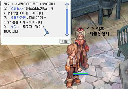 하지만 여러분들에게 돌아가는 삿갓은 단 1개뿐이다. 나머지 11개는 암시장으로 판매해 프론테라의 노점들을 통해 유통되는 것이다. 즉, 한 사람이 삿갓을 만들 때마다 나머지 11개의 물건이 대량으로 시장에 풀려버리니 삿갓은 흔해질 수밖에 없고 가격은 싸질 수밖에 없다. 범인은 바로 인적이 없는 알데바란에서 사람들을 농락한 ‘어떤상인’이라는 녀석이다. 모두들 이녀석의 범죄를 눈치챘다면 이 녀석의 집을 파이어월로 불질러버리자!!