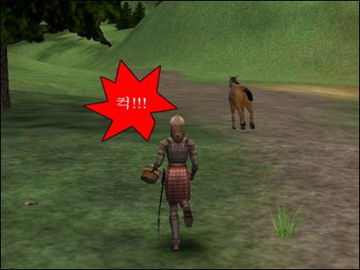 역시 새로운 경험은 멋진 것이었다. 비록 망토는 없지만 코텰을 휘날리며 달리는 러프의 마음은 벌써 루드로우 마을을 지나치던 고렙이 된 냥 날아갈 듯 했다. 그런데 혹시나 하는 생각이 들었다. 이 말이 점프도 뛸 수 있을까? 오... 내가 분명히 전에 말이 점프를 뛰는걸 본적이 있는 것 같어. 분명해! 난 아무생각 없이 평소 TV에서 보던 승마의 한 장면을 연출하기 위해 [Space Bar] 버튼을 눌렀다. 순간 내 눈 앞에서 사라져가고 있는 말의 모습. -_-; "헉"하는 비명과 함께 말을 향해 달렸지만 말은 지 등위에서 타고 있던 사람이 떨어지든 말든 나처럼 아무 생각 없이 앞을 향해 뛰고만 있었다. 그렇다. 말에서 점프를 뛰면 그냥 내려버리는 것이다. 나처럼 말이 점프를 뛴다고 상상하는 왕초보들이여... 조심하자. 결국 아무도 안다니는 길에서 지리조차 모르던 난 절망감에 사로잡혀 개미밭에 맨손으로 뛰어가 자살해버리고 말았다. ㅠ.ㅠ