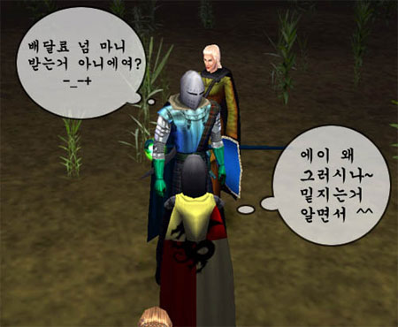 멜로우: “자자 날이면 날마다 오는게 아님다. 인벤비워주기맨 멜로우임다” 파티사람들: “오호~” 멜로우: “세금은 10% 임다 ^^” 파티사람들: “오케 오케” 이거 속도가 좀 느리다 뿐이지만 몇 번만 왕복하면 꽤 많은 수입을 보장받을 수 있다. 혹은 넘치는 암스맨의 힘을 이용해 크래프트 아이템을 배달하기도 한다. 이 얼마나 간편한 돈벌이 수단인가? 물론 다옥의 특성상 저 정도 렙에 사기를 친다는 것은 불가능하다. 그 바닥이 그 바닥이고 이 바닥이 이 바닥이기 때문에… ^^ 이거 요즘에 각광받는 사업이라고 한다. 혹시 모르지 ‘힐한방에5골드’와 같은 길드가 존재하듯 ‘심부름센터’와 같은 길드가 따로 생겨날지;;;; |