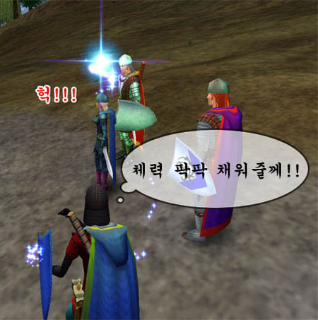 “아 저기 메로메로님. 뭔가 체력이 쭉쭉 차는 느낌인데 불안해요 ㅠ.ㅠ” 라고 말해도… “괜찮습니다. 이게 지대로 들어가는 힐입니다” 라며 우기곤 했다. -_-; 같이 사냥을 하던 시절 무조건 라지힐만 우기면서 힐을 넣다가 죽곤 하던 메로메로는 “어 왜 탱커들한테 타운트가 안되지?”하며 어리둥절했다고 하는데… 결국 25레벨에 한 지인을 만나 남들 다 하던 마이너 힐의 비법을 전수받게 된다. 뭐 지금은 훌륭한 클레릭이 됐지만 ^^ |