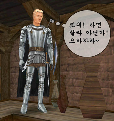 ② 1골드짜리 갑옷에 30골드짜리 염색약을 바르다 비교적 회사 다옥 멤버(?)에서도 늦둥이로 캐릭터를 키운지라 킹키에 대한 다른 친구들의 지원은 전폭적이었다. 1골드도 가지고 다니기 힘든 레벨 10에 450골드를 가지고 다녔다면 할 말 다한게 아닐까? ^^ 암튼 그 정도 레벨에 무슨 돈을 쓸 데가 그렇게 많은지… 길바닥에 돈을 뿌리고 다니는지 그 씀씀이만큼은 아머크래프트 레벨 1000이 넘는 50레벨 캐릭터에 버금가는 수준이었다. 나는킹키다: “돈 점 주세요” 러프: “저번에 준 돈 어쨌어요? -_-+” 나는킹키다: “몰라여 뭐 이상한 갑옷 샀는데, 저 못 입는 거래요” 러프: “컹~ ㅠ_ㅠ” 이런 식이다. -_-;; 어쨌든 러프의 소개로 원탁의 기사 길드에 가입한 킹키는 어디서 들었는지 길드원의 옷을 검은색으로 맞추라는 얘기를 듣고 사고를 치고 마는데… 나는킹키다: “와 저 검은색으로 전부 염색했어요!” 길드원일동: “아 그래요? 축하합니다” 나는킹키다: “그런데 쪼금 비싼거 같아요” 길드원일동: “에이 하나에 25실버짜리 차콜 염색약이 뭐가 비싸요 ^^” 나는킹키다: “하나에 30골드던데요 ㅡ,.ㅡ” 길드원일동: “헉! 벌써 로얄블랙을 사다니!!!!!” 러프: “아아아아아아악~ 저번에 제가 준돈 전부 거기다 부은 거예요???” 나는킹키다: “검은색 사래매요~” 러프: “오 노~~~”