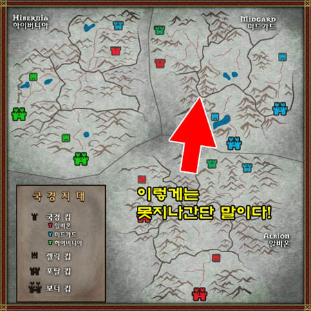 국경의 개념을 살펴보자. 난 처음 알비온에서 열나게 뛰어서 세상 끝까지 가면 미드가드나 하이버니아의 땅이 나오는 줄 알고 있었다. 누가 지금 들으면 ‘아니 이런 무식한 사람이!!’라며 혀를 차겠지만 초보 때는 다 그런 것이다. 50레벨 되면 무조건 로봇 태권 V가 되어 세상의 지존으로 군림할 것 같지만 전쟁터에 나가서 한 골백번 죽어봐야 험난한 다옥 인생사를 뼈저리게 느끼지 않는가? ^^