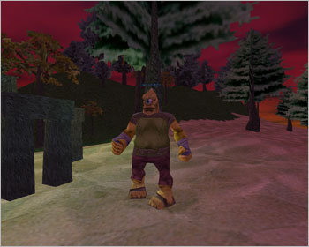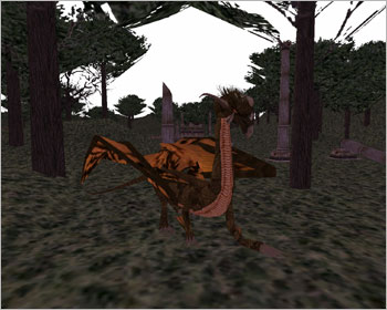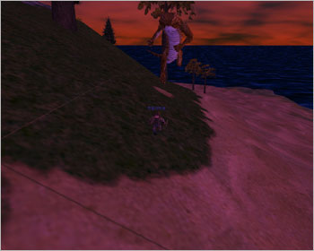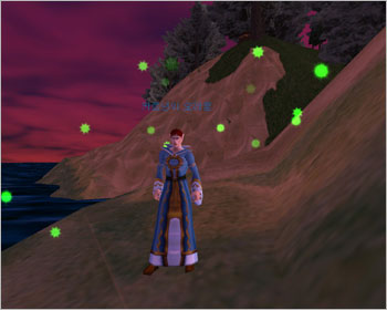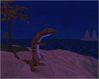배가 두번째 사이렌 섬을 지날 무렵이면 우측으로 아름다운 섬 하나가 모습을 드러내는데…. 흐흐흐(-.-;) 그렇지만 그 섬에는 포악한 도마뱀 '알레즈 웨이소르'가 살고 있으니 조심해야 한다. 레벨이 무려 50이나 되기 때문이다. 나도 예전에 배를 타고 가다가 '달리기' 버튼을 잘못 눌러서 바다에 떨어지고 말았는데 외치기로 사람들에게 구조요청을 했더니 배가 정박하는 섬까지 가서 다음 배를 기다리라고 충고했던 적이 있다. 그러나 근성의 드워프인 나는 배를 기다리지 않고 무조건 수영을 하다보니 저~ 멀리 섬이 하나 보이는 것이 아니겠는가. '이제 살았구나!'하며 섬에 도착했더니 뭔가 '쿵 쿵 쿵' 소리를 내며 달려오더니…. 퍼벅(단 한방). 그 다음은 나도 잘 몰라. 바로 바인드 포인트로 날라가버린 뼈아픈 경험도 해봤다. 두 번 다시 가고 싶지 않지만 기행문에 그 놈의 모습을 공개할 목적으로 조심스럽게 섬에 상륙! 해안선을 따라 거대 도마뱀 알레즈