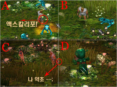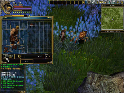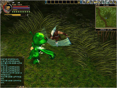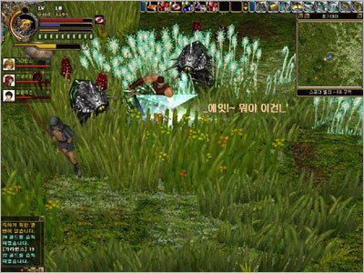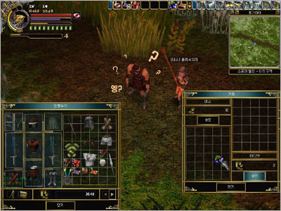 이런! 거래를 해 봤어야지! 어쨌든 창을 열고 상대방 인벤토리안에 아이템을 계속 떨구어도 자꾸만 내 인벤으로 돌아와 버렸다. 알고보니 내 인벤에다가 놓은 것이었으니... ㅠㅠ 이렇게 해서 겨우겨우 거래하는 법을 배운 난 마을에 와 수많은 전사, 레인저의 돈을 갈취한 대머리 스킬 마스터를 찾아가 대금을 물고 스킬 ‘더블 휠링‘을 배웠다(알고보니 그다지 쓸모없는 스킬이었다!!--; 위력도 별로인데다 마나만 소비하는... ). 아무튼 난 빈털터리가 되었지만 빨리 스킬을 사용해 보고 싶은 마음에 잔뜩 들떠 있었다. 그리고 나의 첫 번째 스킬 희생물이 된 놈은 다름아닌 큐티(귀여운) 지네... 2개의 빨간 면봉을 단 꼬리를 살랑살랑 흔들며 스물스물 움직이는 녀석이었다. 이봐! 좀 죽어줘야겠어! 난 서둘러 방금 배운 더블휠링을 사용했다. 그런데... 엥? 뭐야 이건? 칼만 두 번 휘둘렀지 조금도 나아진게 없지 않은가?