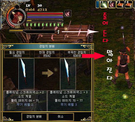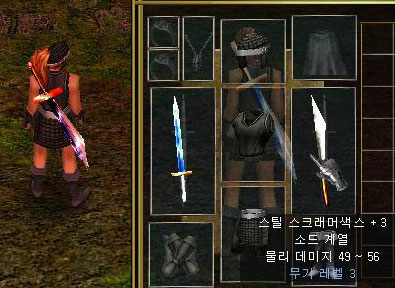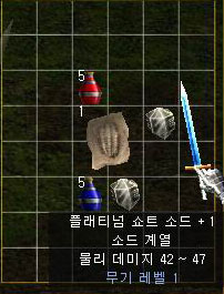 지성이면 감천이라 했던가? 좀 전까지 청승맞게 꺼이꺼이 울고있던 난 순식간에 영혼석을 2개나 얻을 수 있었고 친절아줌의 조언대로 룰루랄라! 콧노래를 부르며 스틸 스크래머색스와 플래티넘 쇼트 소드에 영혼을 불어넣었다. 슈악~ 드디어 싸우다 얼굴한 번 비춰보지 못했던 녹슨 칼이 삐까번쩍 광채를 내며 이글거리기 시작했다. 오옷!! 마침내 ㅠㅜ; 너무 기쁜 나머지 소리라도 지르고 싶은 심정이었다.