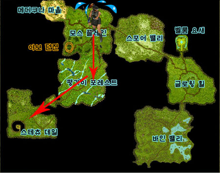 영혼석을 구경 못하면 내 이 펑가이어 초원에 내 뼈를 묻으리라! ㅠ_ㅜ 라는 비장한 각오라도 하듯 멋지게 기지개(?)를 편 난 주저없이 스테츄 데일로 향했다. 그곳은 박치기의 고수 ‘문어’들이 출현하는 펑가이어 포레스트를 한참 지나 남서쪽으로 내려가야만 도달할 수 있는 곳이었다.