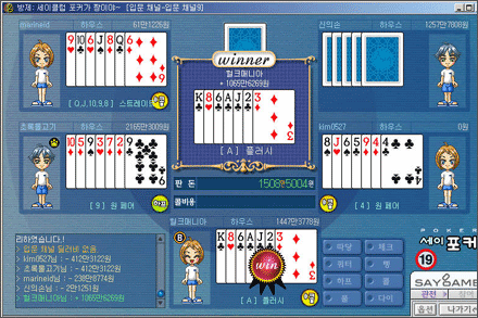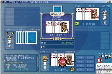 6물론 풀 하우스로도 죽어야 할 경우가 있지만 이런 경우 죽는다는 것은 조상님에 대한 배반이다. 상대방이 하프 레이즈를 기다려 계속 하프 베팅. 결국 견디지 못한 신의손님이 콜. 손님이 적어 큰 대박은 터트리지 못했지만 자본금을 2배로 늘려 여유있는 플레이를 할 수 있는 기반을 마련했다 |