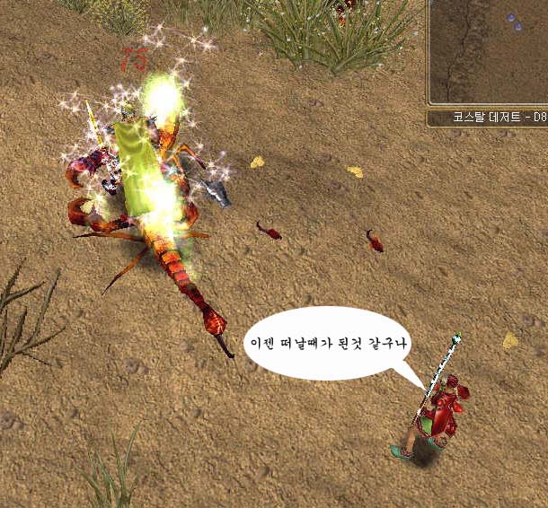 또 위험에 빠질 때마다 테미시안님은 마법을 이용한 파이어공격과 아이스공격으로 위기를 모면시켜 주셨다. 하지만 고스탈 데저트의 지존 등극을 눈앞에 두고 테미시안님이 한 말씀 하셨다.