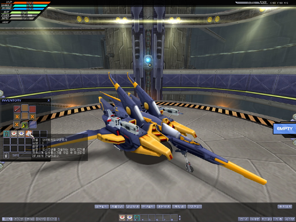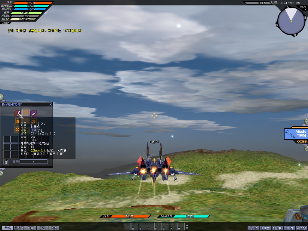 인벤토리창(단축키 ‘I’ or F5)을 열어보면 기체의 HP를 채울 수 있는 응급수리 키트가 10개, SHIELD를 채울 수 있는 일반 쉴드 키트가 10개, 그리고 연료를 채울 수 있는 연료가 기본적으로 10개 제공된답니다. 그리고 스페이스 카우보이에서 돈으로 쓰이는 Spi는 300Spi가 제공되구요. 다 확인 하셨나요?