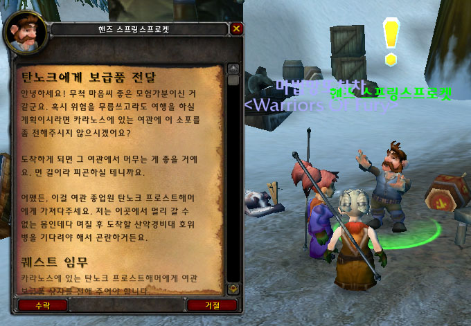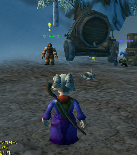 캐릭을 만들게 되면 우선 눈마루 골짜기의 추운 눈 밭위에 뎅그러니 있게 됩니다. 그러나 놀라지 마시고 정면을 살펴봅시당. 머리위에 노란 느낌표 아저씨! 보이시죠? 이 아저씨가 바로 첫번째 퀘스트를 주는 아저씨입니다. 가까이 다가가서 마우스 우클릭을 꾸욱 해줍시다.