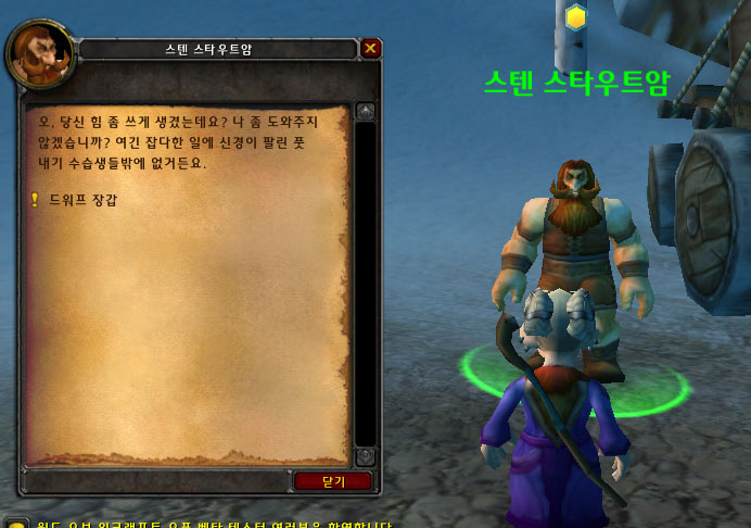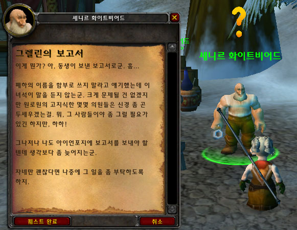 완료 하고 그렐린 할아버지한테 가면 도둑맞은 일지 퀘스트를 주네요. 일단 받아두고 망명자의 곤경을 완료 받으러 가기 전에 아까 미루어둔 노리 프라이드드리프트에게 말을 걸어 뜨거운 새벽주 배달 퀘스트를 받습니다. 5분 지나면 식어버린다네요. 무조건 제일 짧은 거리로 달려갑니다.