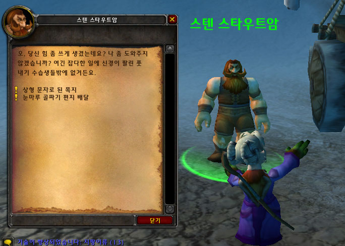 스텐 스타우트암 아저씨, 사람 부려먹는데 이골 난 거 같습니다. 일을 또 줍니다. 이번엔 2개나 있네요. 하나는 제가 마법사라서 그런지, 상급 마법사가 보낸 편지이고, 하나는 또 일거리군요. -ㅅ-; 뭐, 할 일도 없으니 일단 시키는 대로 해봅니다(백수의 설움 ;ㅅ;).