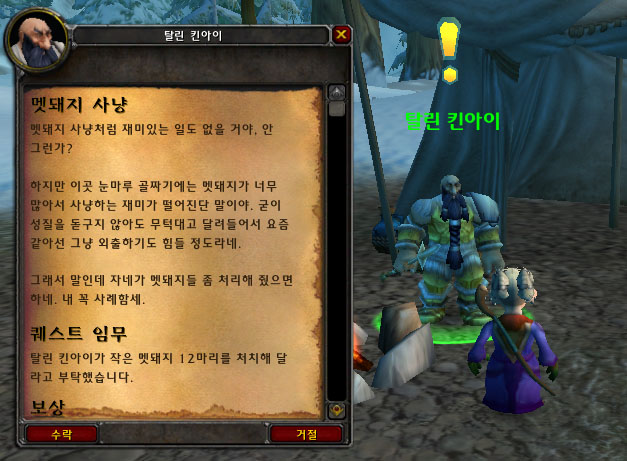 이 편지를 그렐린 화이트비어드에게 주라고 하는군용. 눈마루 골짜기 편지 배달(2) 퀘스트를 일단 수락해 놓고 다시 머리에 `시킬 일 있으니 빨리 말 걸어라~`하는 표시를 띄우고 있는 탈린한테 말을 겁니다. 멧돼지 사냥이란 퀘스트로, 멧돼지 잡으래요.