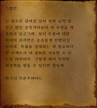 노리에게서 50코퍼를 받고 나면 이제 남은 것은 트롤동굴에서 냉혈한 그리크니르를 처치하고 도둑맞은 일지를 되찾아 오는 겁니다.