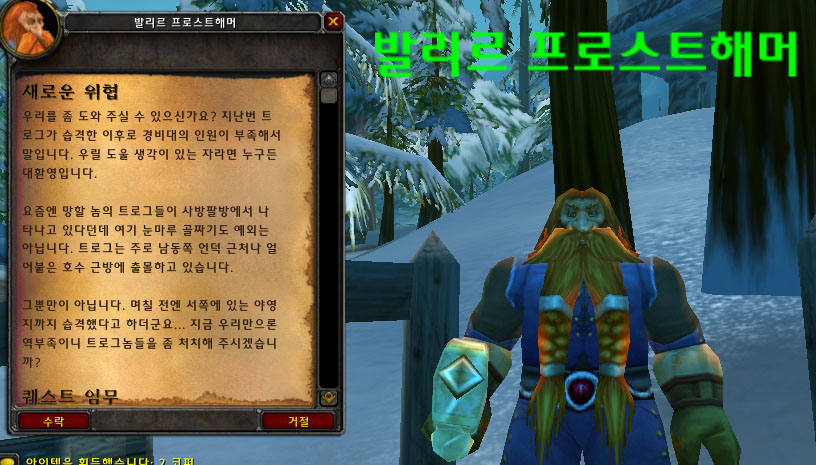옆의 발리르 프로스트해머가 한마디 보탭니다. "어이~트로그좀 잡지?" 네, 새로운 위협 퀘스트를 주는군요. 역시나 닥치는대로 보이는 트로그들을 잡습니다. ;ㅅ;