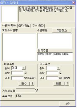 그리고 이 곳이 여각이라는 곳인데. 여기에서 주식 거래가 이루어지게 됩니다. 아까 말한 마을의 주식이 이곳에서 이루어지는 것이지요. 신규 서버의 경우 새로 마을의 주식을 발행할 때 공매를 하는데 이때 얻은 주식이나 이 여각을 통해 주식을 팔 때 또는 주식을 살 때 이곳을 이용하게 됩니다. 여각의 메뉴는 다음과 같이 구성 되어 있는데, 사용할 때는 매수 또는 매도를 나누어 사용 하게 됩니다. |