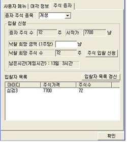 옆의 예를 통해 살펴보면 개성이라는 마을에서 주식을 증자한 경우입니다. 군주에서는 주식을 더 사고 싶은 마을은 선택 할 수 있습니다. 물론 그 마을이 증자를 했을 때지요. 그리고 그 아래가 증자를 하는 주식수(여기서는 72주이겠지요?)입니다. 낙찰 식으로 진행되기 때문에 낙찰액을 쓰면 됩니다. 이제 입찰 신청을 하면 입찰이 마감 된 후에 가장 높은 가격에 입찰 한 사람에게 주식이 돌아가는 형식으로 운영이 됩니다. 물론 입찰자가 없으면 마을의 증자는 실패 하는 것이지요. |