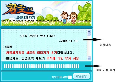 위 아이콘을 더블 클릭해서 군주를 실행시키게 되면 왼편처럼 하나의 창이 열리고 하얀색 막대가 주르륵 오른쪽으로 증가하는 것을 볼 수가 있지요. 왼쪽 그림에서 설명한 것처럼 패치가 진행 되는 동안에 이번에 패치된 내용과 지난번에 패치된 내용을 살펴 볼 수 있으니까 패치가 진행되는 동안 패치된 내용을 읽어보는게 게임을 하는데 도움을 받을 수 있습니다. |
