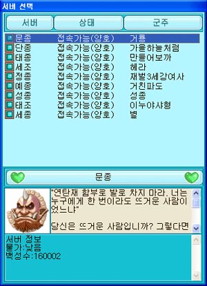 로그인을 하면 왼편처럼 서버의 상태와 해당 서버의 군주가 누구인지 알려주는 창이 보이게 될거에요. 아직 서버를 결정하지 못하였다면 아래쪽에 현재의 군주님이 남긴 한마디와 물가 상태, 백성의 수(해당 서버에서 플레이 하는 전체 사람의 수)를 확인 할 수 있으니까 참고해서 원하는 서버를 선택하면 되겠죠? ?여기서 잠깐!! 백성의 수가 무조건 많아야 좋거나 적으면 나쁘다는 것은 잘못된 상식이니까 주의하세요. 그럼 캐릭터를 선택하는 창이 뜨게 됩니다. 게임을 처음 하는 분이라면 아무 캐릭터도 만들어져 있지를 않겠죠? 그럼 캐릭터 만들기를 클릭하면 새로운 캐릭터를 만들 수 있는 창이 뜹니다. 원하는 캐릭(견이, 연이)을 선택하고 캐릭터 이름을 정하여 준 이후에 생성을 누르면 끝. 캐릭 만드는 과정은 아주 쉽죠? ^^ |