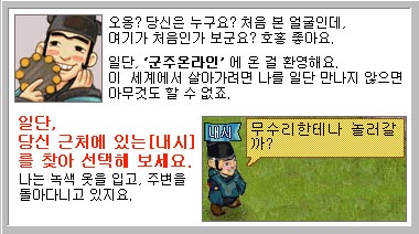 캐릭터를 만든 후 군주에 처음 로그인하게 되면 당신에게 내시가 당신에게 말을 걸어옵니다.