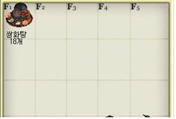 소지품 창의 모습인데 창 위쪽의 줄에 F1~F5까지 써져 있습니다. 거기에 아이템을 올려 놓으면 해당하는 키를 누를 때마다 그 곳에 올려져 있는 아이템을 사용 할 수 있습니다. 그림과 같이 F1에 쌍화탕을 가져다 놓는다면 체력을 채울 때 좋겠지요? 초보자수련장은 초보자들이 레벨을 올리도록 만들어 진 것이니 만큼 초보자에게 적합한 곳이니 이곳을 잘 이용해보세요. 아마 이 곳에서 레벨 10을 올리는 것이 다른 곳에서 올리는 것 보다 편하니 이곳을 이용하는 것이 레벨 10까지는 무난합니다. |
