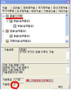 옆에 보면 상단에 있는 것들이 모두 기술을 나누어 놓은 것이에요. 많죠? 뭐 그만큼 여러 가지의 특색 있는 캐릭터를 만들 수 있다는 것이니까 남다른 재미를 가질 수 있겠지요? 기술 정보창 아래에 보면 기술 점수라고 써 있는 곳이 보일 것입니다. 이 기술 점수는 자기가 익힐 수 있는 기술의 수를 알려 주는 것이지요. 예를 들면 지금 내 기술 점수는 2인데 이 기술 점수 만큼 즉 2권의 책을 읽어 기술을 익힐 수 있다는 것이지요. 물론 이 기술을 읽으려면 책이 필요합니다. 그리고 부모기술이라는 것이 있는데 부모기술 이라는 것은 다른 기술을 읽히기 전에 꼭 익혀야 하는 기술을 말합니다. 예를 들어 검술 아래에 창술과 부술이 선으로 이어져 있는데요. 바로 검술이 창술과 부술의 부모 기술이 됩니다. |