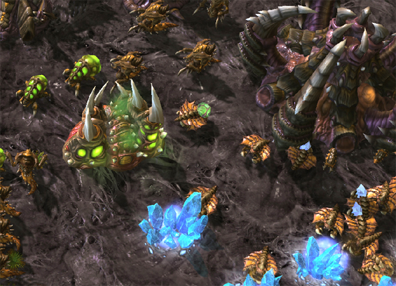 편리성이 극대화된 인터페이스와 기능 인터페이스를 비롯하여 컨트롤에 필요한 부가 기능들이 상당히 편리해졌다. 먼저 AI 개선. 나의 경우 프로토스로 처음 플레이를 했는데, 넥서스를 선택한 뒤 미네랄에 마우스를 클릭해두면 프로브가 나와서 자동으로 미네랄을 생산했다. 가스도 마찬가지 방식이었다. 게다가 일꾼 여러 마리를 선택하여 하나의 미네랄을 클릭하면, 전부 하나로 몰려가는 것이 아니라 지들이 알아서 사이좋게 방향을 나누었다. 다음으로는 복수 선택과 부대 지정을 꼽을 수 있다. 최대 12마리까지밖에 되지 않던 복수 선택이 24마리로 증가했고, 단축키로 부대 지정을 할 경우에는 24마리 이상도 가능했다. 만약 질럿 25마리를 단축키 1번 부대로 지정하면, 유닛 정보가 노출되는 영역에 24마리가 (1)번 소대가 되고, 나머지 1마리는 (2)번 소대로 표시됐다. 각 소대 번호는 아이콘으로 분류되어 있었기 때문에 그것을 누르면 해당 부대의 상태를 단번에 확인할 수 있었다. 이 복수 선택은 유닛뿐만 아니라 건물에도 적용됐다. 게이트웨이 10개를 선택하여 단축키 1로 지정해둘 수 있다는 말이다. 단, 복수 선택된 건물에서 유닛을 생산할 경우에는 한 번만 누르는 것이 아니라 선택한 건물의 수만큼 눌러줘야 했다. 한번 누르면 선택된 건물 중 첫 번째에, 한 번 더 누르면 두 번째에 적용이 되기 때문이다. 유닛들의 업그레이드도 이와 같은 방식이라 10마리의 히드라를 선택하여 럴커로 업그레이드 시키려면 1번이 아닌 총 10번을 다다다닥 눌러줘야 했다. 처음에는 귀찮았는데 내가 원하는 만큼만 할 수 있었기 때문에, 세부적인 컨트롤을 하는데 있어서는 훨씬 더 유용해 보였다. (한번에 할 수 있는 기능은 확인하지 못했음)