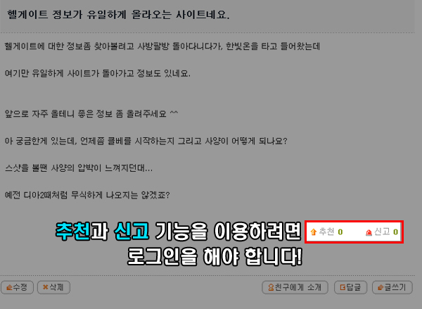 게임메카 회원은 등록된 게시물 중 마음에 드는 정보 등을 추천할 수 있습니다. 추천이 5개 이상이 되면 제목에 `추천`마크가 붙게 됩니다. 가장 많은 추천을 받은 두 개의 게시물은 게시판 상단에 추천 게시물로 등록됩니다. 마찬가지로 가장 많은 조회수의 게시물 역시 게시판 상단에 조회 게시물로 등록되어 더욱 많은 유저들과 정보를 공유할 수 있습니다. 단, 조회수와 추천이 동시에 많은 게시물의 경우에는 추천이 아닌 조회수를 기준으로 게시판 상단에 등록되니 참고하시기 바랍니다. |