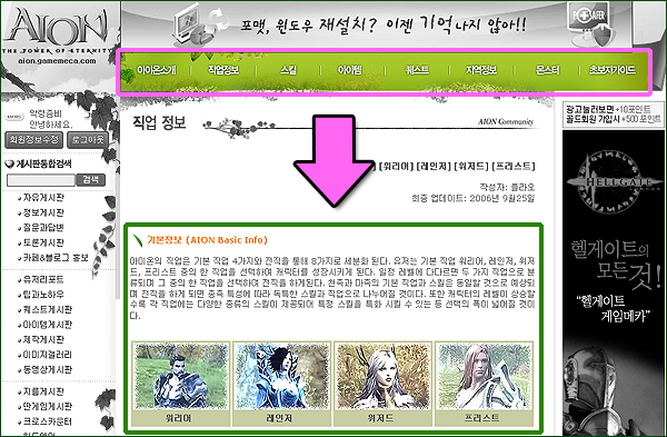 안녕하세요. 아이온 게임메카 담당 CM `플라오`입니다. 아이온은 아직 공개된 정보가 적기 때문에 사이트를 통해 많은 것을 보여드릴 수 없습니다. 다만 말씀드릴 수 있는 것은, 여러분과 함께 아이온을 기다리는 동안 새롭게 공개되는 정보를 가장 빠르고 정확하게 보여드릴 수 있도록 최선을 다해 노력하겠다는 것입니다. `아이온 게임메카`를 방문하시는 분들의 이용의 편리를 위해 사이트의 기능을 설명해 드리겠습니다. |