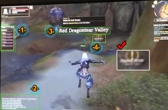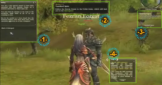 아이온의 인터페이스는 특별히 눈에 띄는 부분이 없는 무난한 형태이다. 좌측 상단의 `캐릭터 정보`와 아래로 `파티원 정보`, 우측 상단의 `미니 맵`과 아래로는 현재 진행하고 있는 `퀘스트의 요약 설명`을 볼 수 있다. 왼쪽 하단은 `채팅 창이 위치하며 이미지에는 나오지 않았지만 중앙 하단에 `스킬창`이 위치하고 있다. 각각의 기능을 알아보자.