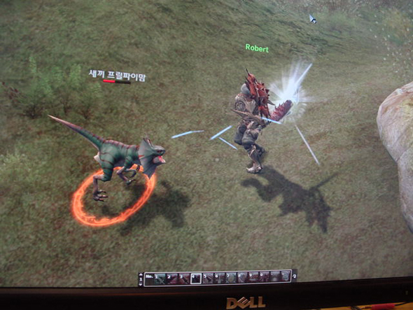 캐릭터가 착지한 지점에서 길을 따라 앞으로 이동하며 만나는 몬스터를 처리하자. `스콜피온`이나 `새끼 프릴파이맘`과 같은 파충류 계열의 몬스터를 만날 수 있다. 기본적으로 스킬은 퀵 슬롯에 등록되어 있기 때문에 쉽게 사용할 수 있다. 다음 이미지와 같이 하나의 퀵 슬롯에 총 12개의 스킬을 등록할 수 있다. Ctrl키나 Alt 키를 누른 상태에서 스킬을 등록하여 퀵 슬롯을 확장할 수 있다(총 3개의 퀵 슬롯이 제공된다). 기본적으로 퀵 슬롯에 등록된 스킬을 살펴보면 `1~5번`, `8~0`번 까지 스킬이 활성화 되어 있다. 나머지 비활성화 된 `6, 7`번과 `-, =`번은 적을 넘어뜨리거나 스턴과 같은 조건을 만족시키면 활성화가 된다.
