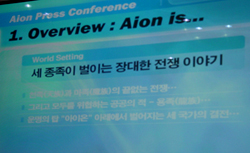 지용찬 팀장은 아이온의 특징을 설명하면서 리니지와 차별화를 두어 프랜차이즈로 동서양을 모두 만족시킬 수 있도록 개발 중이라고 한다.
