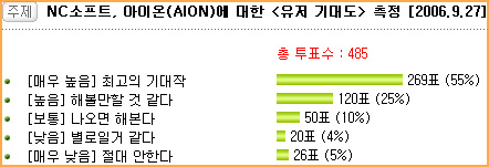 2006년 9월 27일 부터 11월 24일까지 두 달간 시행된 `NC소프트, 아이온(AION)에 대한 <유저 기대도> 측정` 투표 결과가 완료되었습니다. 투표에 참여한 485명의 유저들 중에 269명이 최고의 기대작으로 투표하여 아이온에 대한 기대가 높음을 알 수 있었습니다. 그 중에서 `jimmy890` 유저는 "자유 PVP가 아닌게 아쉽다. 그래도 다옥 같은 공성전 해봤으면 좋겠다"라는 의견을 남겼습니다. 투표 진행중에 `지스타2006`이 개최되어 아이온을 직접 플레이 할 수 있는 기회가 있었습니다. 많은 유저들이 아이온을 체험하면서 게임에 대한 기대도가 높아진 것으로 분석됩니다. 전문가들은 앞으로 마족이 공개된다면 아이온의 인기가 더욱더 상승 될 것으로 전망하고 있습니다. 다음 투표는 `[인기투표] 가장 플레이 하고 싶은 직업은?` 입니다. 많은 참여 부탁드립니다. |