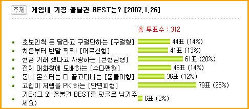 2007년 1월 26일부터 5월 3일까지 4개월 동안 진행된 `게임 내 가장 꼴불견 BEST는?` 에 대한 투표가 완료되었습니다. 온라인 게임을 즐기는 유저들이라면 모두 공감할 수 있는 주제로 투표에 참여한 311명의 유저들 중에 79명이 `고렙이 저렙을 PK 하는 유형` 을 최고의 꼴불견으로 뽑아 주었습니다. 이번 투표를 통해 알 수 있는 사실은 초보 유저들을 도와주지는 못할망정 무분별한 PK를 일삼는 일부 비매너 유저들 때문에 게임의 흥미를 쉽게 잃고, 안 좋은 인식을 심어주게 되는 계기가 아닐까 생각합니다. 최근 아이온 공식 홈페이지에선 아직 공개되지 않은 `PK 시스템`에 대한 열띤 토론이 진행중에 있습니다. 기타 의견으로 `로즈1단` 님은 사냥하는 데 옆에 와서 깐죽거리는 [시비형], 먼저 깐죽거려 놓고 전쟁하자는 [뒷백형], 잘못 해놓고 더 큰소리 [오리발형]이라는 재미있는 의견을 남겼습니다. 이외에도 `초보무시`님은 자신은 할 때부터 모든 것을 다 알고 있는 것 마냥 초보들 무시하는 개구리 같은 인간들 [개구리 올챙이 때 생각 못하는 인간형]을 기타 의견으로 남겨주었습니다. 다음 투표는 `캐릭터 생성시 가장 고민이 되는 부분은?` 입니다. 많은 참여 부탁드립니다. |
