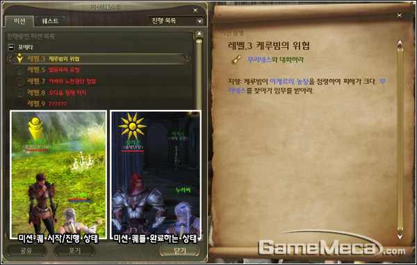 ▲퀘스트 알림이 기능까지 갖추고 있는 친절한 인터페이스 (아이콘으로 미션과 퀘스트를 구분해주는 센스까지 갖추었다)