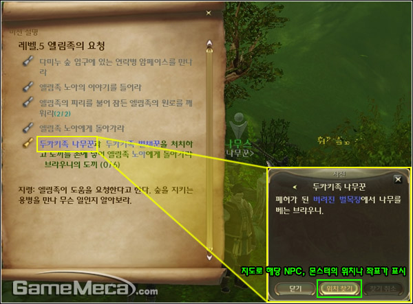 미션/퀘스트 창에서 확인할 수 있는 퀘스트 세부 사항에는 유저가 해당 목표나 NPC의 위치를 검색할 수 있는 사전 기능이 들어 있어 더욱