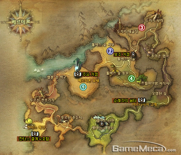 아이온 천족의 두 번째 필드인 베르테론 지역의 지도입니다. 아마 지스타를 다녀오신 분들은 많이 낯이 익으실지도 모르겠습니다. 아이온 체험관에서 천족 시작지이자 마족이 다이렉트 포탈을 타고 침공해온 곳 역시 바로 이 베르테론 지역의 한 부분(정확히는 톨바스마을)이었으니까요!