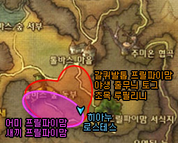 톨바스 숲 동부의 히아누가 있는 위치는 아래 지도와 같습니다. 히아누가 있는 곳으로 향하시면서 주변의 갈퀴발톱 프릴파이맘을 사냥해두시기 바랍니다.