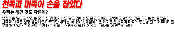 홍보와 모집은 어떻게 하고 있습니까. 저희 길드는 천족지향 길드입니다. 20세 이상의 아이온을 좋아하시는, 그리고 매너를 갖춘 분들은 누구나 가입가능합니다(현재 19세부터 받고있습니다). 타 길드와 차별되는 컨셉이 있습니까? 무엇보다 가족적인 분위기를 지향하고 있으며 현모임또한 계획중에 있습니다. 그리고 모든 천족의 선두에서기위해서 항상 노력하고 있습니다. 1서버에서 계속 활동할 계획이십니까? 성인서버가 따로 존재한다면 달라지겠지만 현재는 1서버를 지향하고 있습니다. 길드와 관련돼 하고 싶은 말이 있다면? 저희 길드는 슬로건인 가족적인 분위기를 항상 유지하면서 많은 유저분들의 커뮤니티를 위해 항상 노력할것입니다 ^^