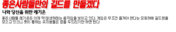 타 길드와 차별되는 컨셉이 있습니까? 저희 길드는 현모임등 친목도모를 위주로 하되 각종 쟁탈전에 참가합니다.. 1서버에서 계속 활동할 계획이십니까? 물론 1서버를 목적으로 추진중입니다. 길드와 관련돼 하고 싶은 말이 있다면? 직장인으로써 온라인 게임을 좋아하는 3050대 유저분 모두 대환영합니다.