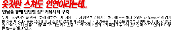 길드규모(인원)은 어느 정도입니까? 길드 가입되어있는 분들은 현재 20명 정도입니다. 길드 만들고 초기엔 홍보를 많이 했지만, 지금은 거의 안하고 있거든요; 이마저도 가출하신 길드원 분들이 많아서.. 돌아오세요ㅜ.ㅜ(죄송합니다-_-;ㅋ) 홍보와 모집(가입제한)은 어떻게 하고 있습니까. 현재는 홍보를 중단한 상태입니다. 곧 공홈의 자게 외에 게임 내에서 홍보를 시작해 보려고 생각하고 있습니다. 저희 길드에 가입 제한 같은 것은 없습니다. 자유로운 친숙한 길드가 되고싶습니다^^ 아- 다만 법사&사제 특화인 만큼 법사와 사제만 됩니다;ㅋㅋㅋ 타 길드와 차별되는 컨셉이 있습니까? 가장 큰 컨셉은 직업 특화 길드라는 것이겠지요. 그 외의 것을 말하자면…. 신비주의랄까요-_-;ㅋㅋㅋㅋ 일단 임시반장인 저 자체가 온라인상에서 개인적인 정보를 흘리고 다니는 걸 원치 않아서, 저희는 길드 가입시 본명도 나이도 언급하지 않아도 됩니다.(어차피 친해지면 다 불게되어있지만요;ㅋㅋㅋ) 온라인 상에서의 만남인만큼 온라인의 장점을 최대한 사용하고 싶습니다. 예를 들어 나이가 너무 많아서, 또는 너무 어려서가 온라인 상의 만남에서 문제가 될 이유는 없다고 생각합니다. 마음과 뜻만 통하면 되지 않을까요^^? 1서버에서 계속 활동할 계획이십니까? 처음엔 당연히 1서버! 라고 생각했습니다. 하지만, 역시 길드원 분들의 의견을 종합해봐야겠지요^^ 전 일개 임시반장일 뿐이라서 결정권이 없답니다^^; 길드와 관련돼 하고 싶은 말이 있다면? 가출한 길드원 분들 돌아와 주세요~~~ㅋㅋ