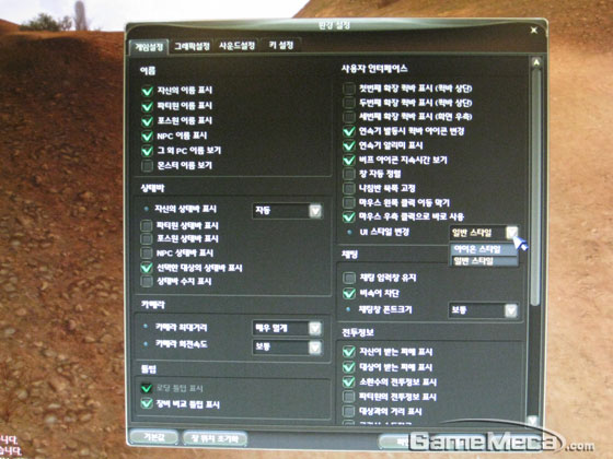 가장 눈에 띄는 점은 게임설정 부분의 세분화였습니다. 특히 UI스타일 변경 기능을 통해 "일반 스타일"과 "아이온 스타일"의 화면 구성을 고를 수 있었던 점은 기존의 게임들과는 달리 화면 우측 아래에 위치해있던 아이온의 미니맵에 불편을 느끼셨을 분들께는 가장 반가운 소식이 될 듯 하군요. 또한 헬멧과 레기온 망토 표시, 캐릭터 시야거리 조정 부분의 옵션도 새롭게 추가된 것이 눈에 띕니다.