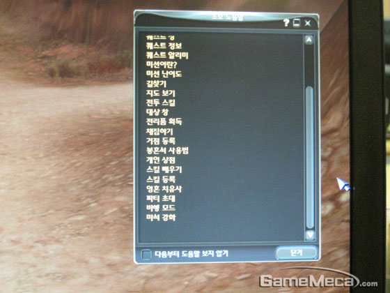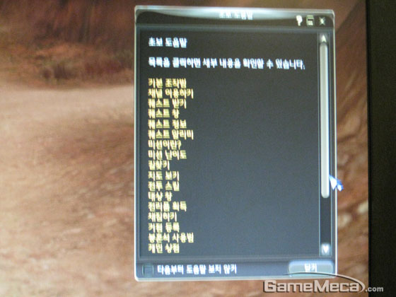 또한 초보 유저분들을 위한 "초보 도움말 인터페이스"가 새롭게 선보였습니다. 이 도움말 메뉴는 캐릭터의 상황에 따라 필요한 정보만 골라서 화면상에 작은 아이콘으로 안내되기도 하지만, 목록 형태로 분류되어 미리 그 내용들을 확인해보는 것도 가능합니다.